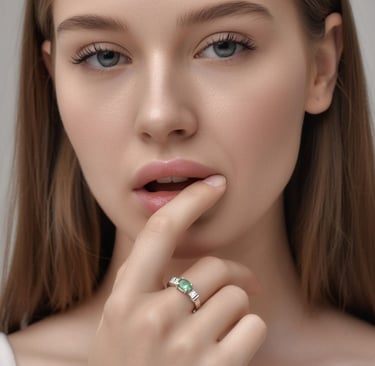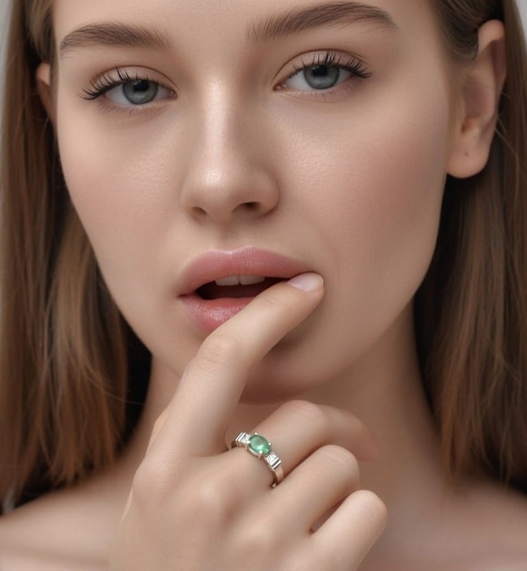 Elegant model wearing a silver emerald gemstone ring with side diamonds for luxury jewelry branding.Highlight that emeralds represent growth, balance, and harmony—making this an ideal anniversary or engagement choice.