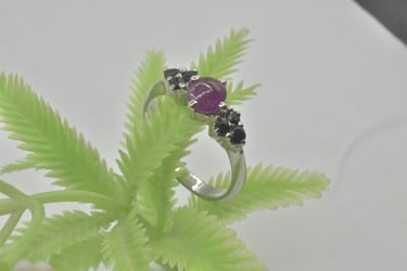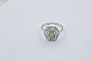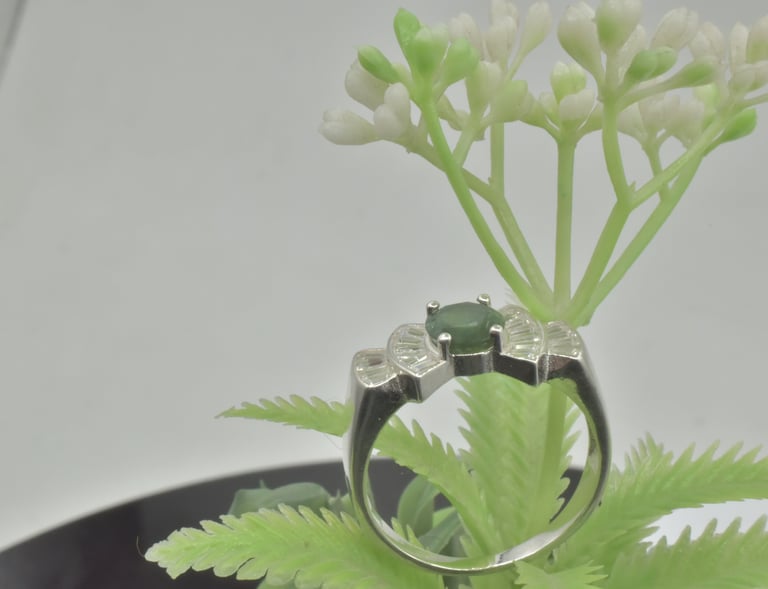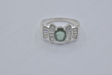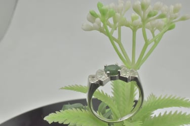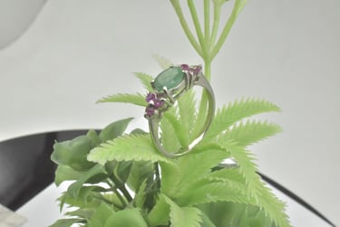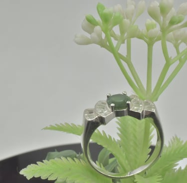 Elegant model wearing a silver emerald gemstone ring with side diamonds for luxury jewelry branding.Highlight that emeralds represent growth, balance, and harmony—making this an ideal anniversary or engagement choice.